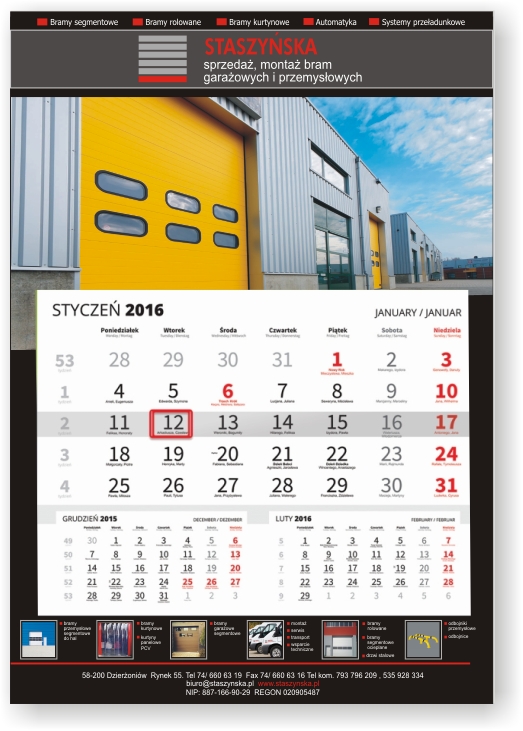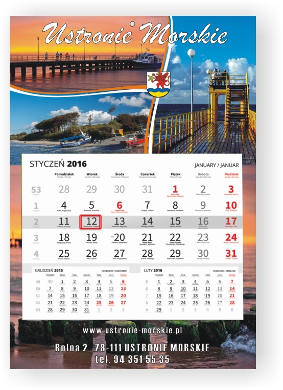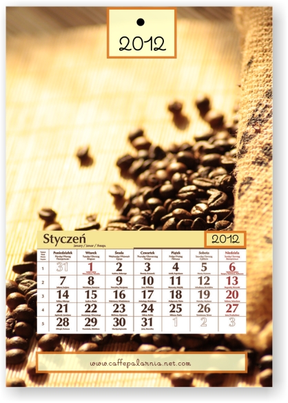 - pełny kolor i dowolny projekt (włącznie ze zdjęciami) na całości kalendarza (główka, plecy i stopka)