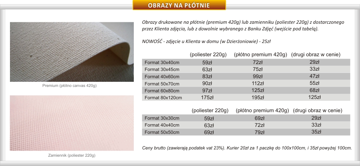 Oferujemy standardowe formaty jak podane niżej oraz na wymiar.